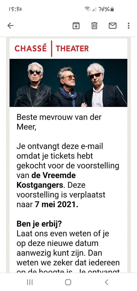 Sources: Casper's Golden Earring Research, NTK booking site, theater website, show not mentioned on Vreemde kostgangers gaan door 2020 tourdates flyer, confirmed date - no show |